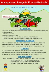 El Ayuntamiento de Redován organiza una acampada en el Paraje dela Ermita, enla Sierrade Redován, los días 14-15 de abril de 2012, con la colaboración del Club de Montaña de Redován.