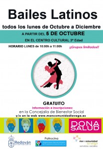 – Taller de Bailes Latinos: todos los lunes de 10.00 a 11.00 horas en la 2ª planta del Centro Social de la Tercera Edad.
