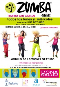 – Taller de Zumba: Lunes y Miércoles de 21.00 a 22.00 horas en el Centro Cultural del Barrio de San Carlos.