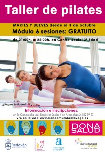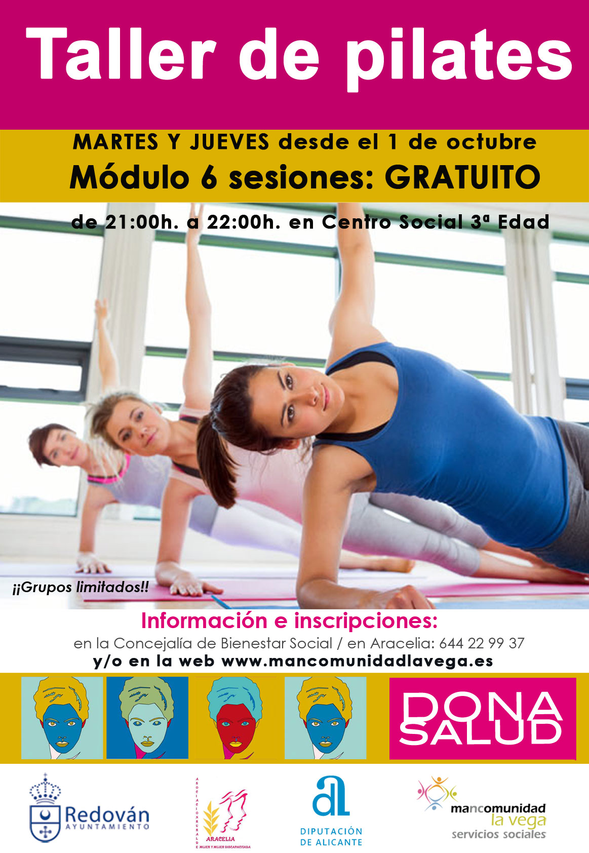 – Taller de Pilates: Martes y jueves de 21.00 a 22.00 horas en la 2ª planta del Centro Social de la Tercera Edad.