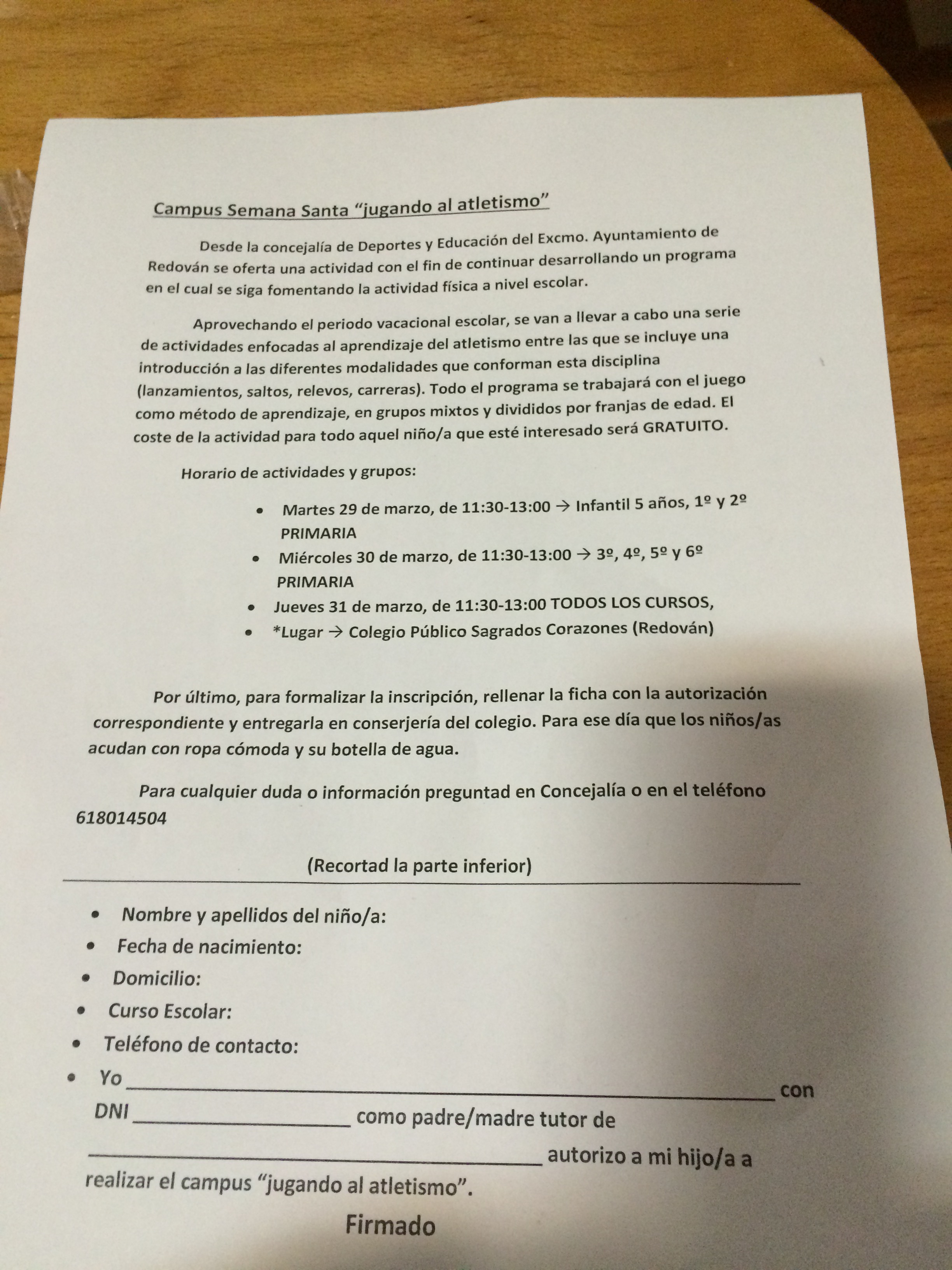 La Concejalía de Deportes y Educación del Ayuntamiento organizan un campus para las vacaciones de Semana Santa ‘Jugando al Atletismo’. Dirigido a niños de infantil y primaria. En la imagen los días, horarios y teléfono de contacto. La ficha se puede recoger en el Consistorio.