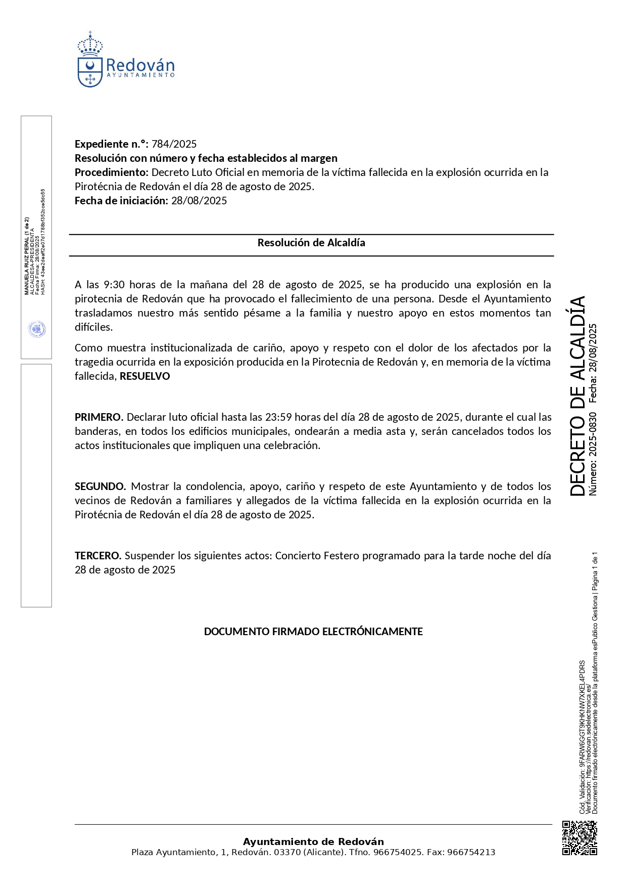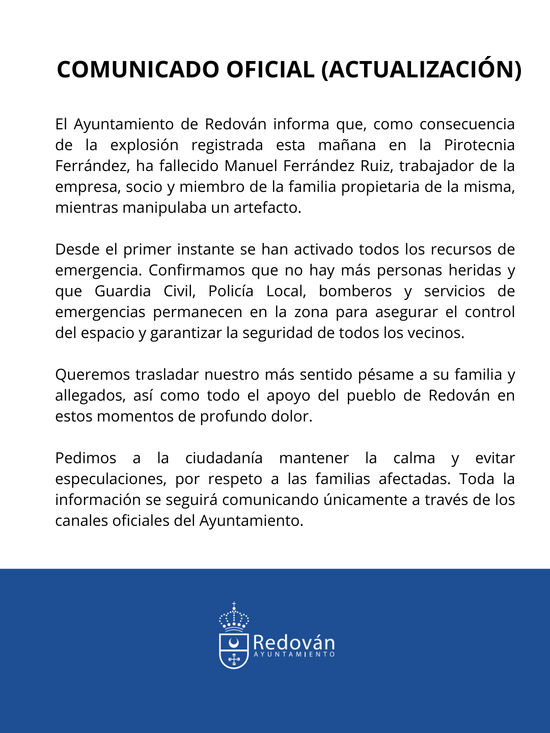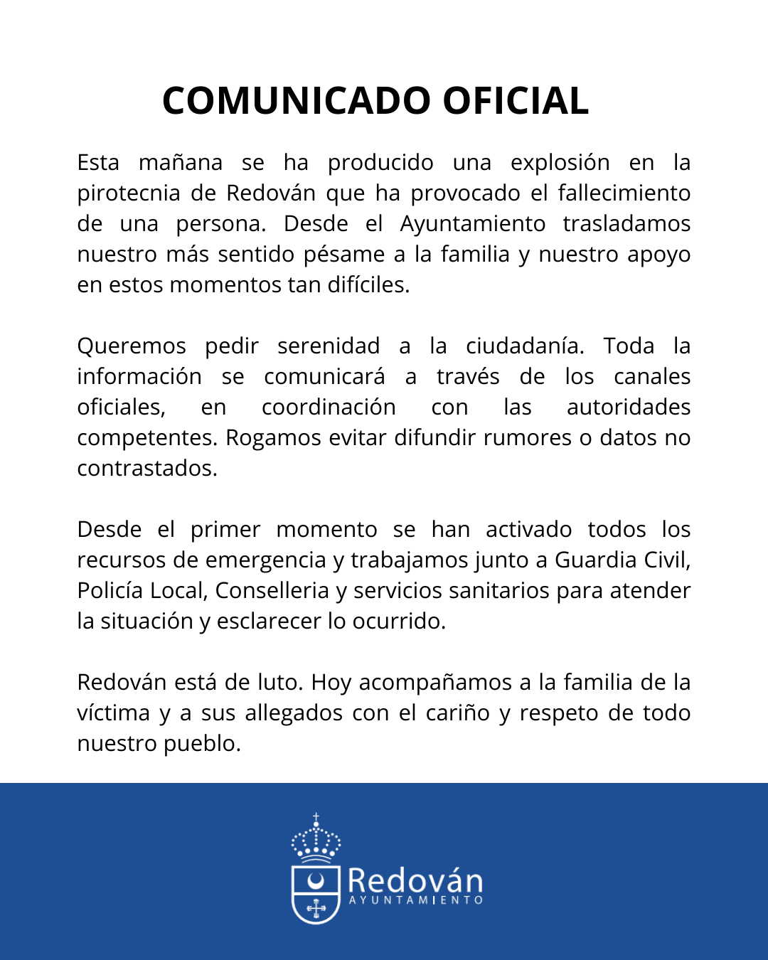 Comunicado oficial del Ayuntamiento de Redován ante los hechos ocurridos en el día de hoy en una pirotecnia del municipio, donde ha fallecido una persona.