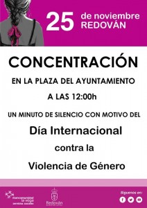 Con motivo de la celebración del 25 de Noviembre, Día Internacional contra la Violencia de Género, se va a realizar una concentración en la Plaza del Ayuntamiento de Redován a las 12 del mediodía. Durante el transcurso del encuentro se guardará un minuto de silencio en homenaje a las mujeres que han sido asesinadas por sus parejas y ex parejas en nuestro país y como símbolo del rechazo de los vecinos de Redován hacia cualquier manera de violencia contra las mujeres.