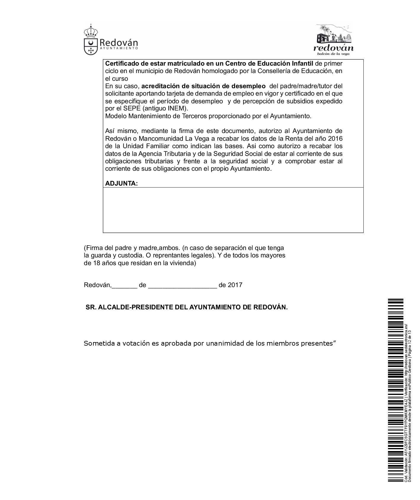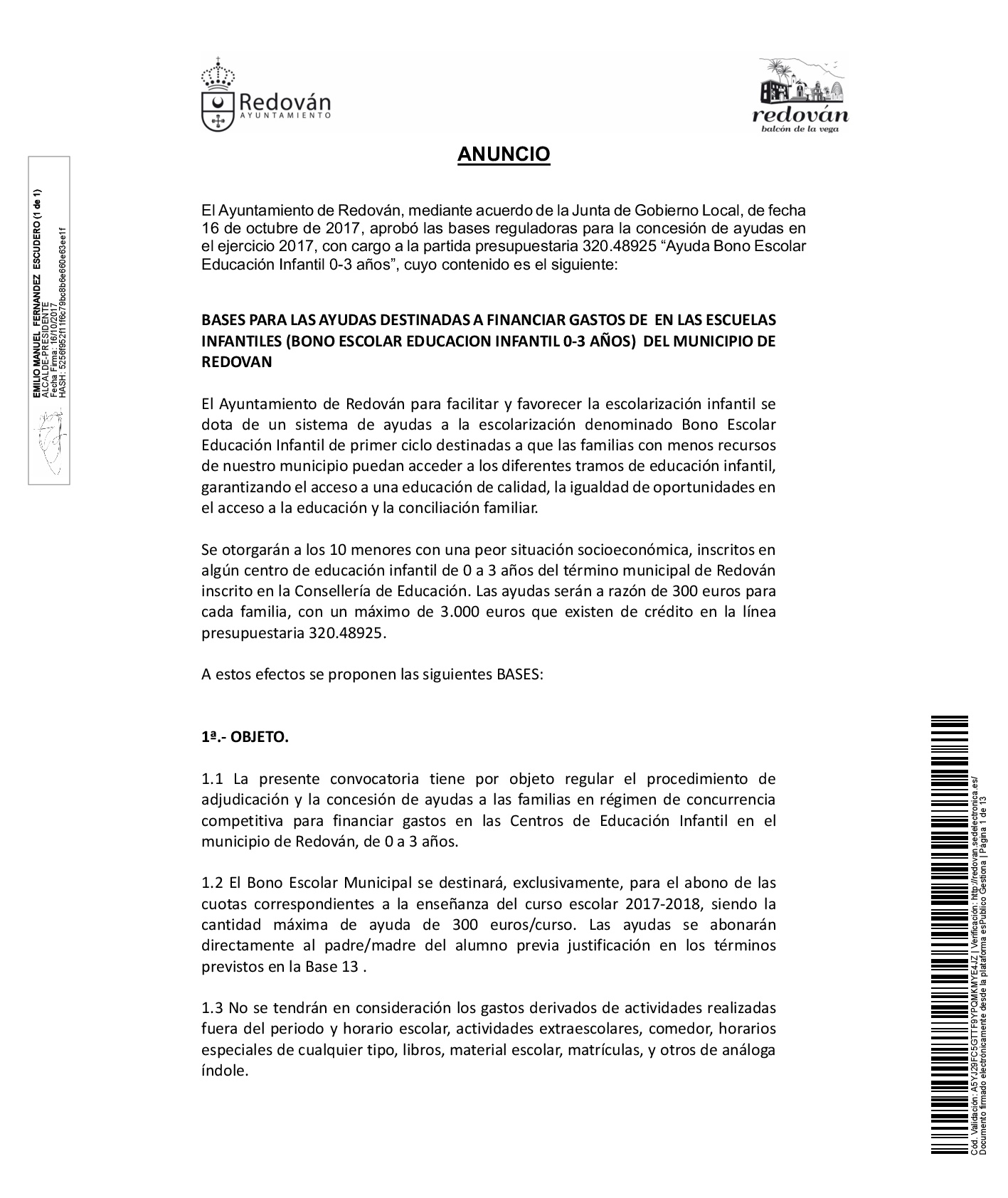 Redován (16/10/2017). El Ayuntamiento de Redován ha aprobado esta mañana la convocatoria de Ayudas Bono Escolar Escuela Infantil 0 a 3 años. Estas ayudas serán de una cuantía máxima de 300,00 euros a 10 menores matriculados en primer ciclo en Escuelas Infantiles del municipio de Redován.