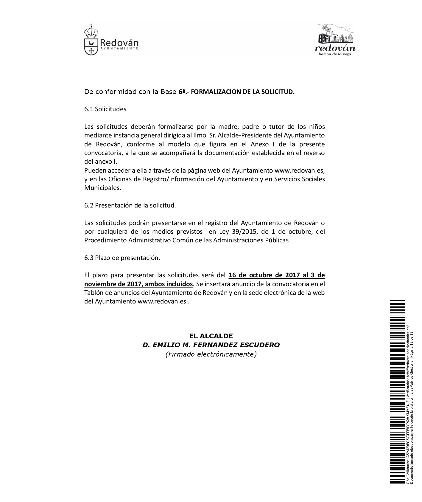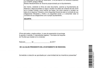 El plazo para presentar las solicitudes será desde hoy 16/10/2017 y hasta el día 03/11/2017 (ambos inclusive). Antes de registrar las solicitudes en el Ayuntamiento se aconseja que las solicitudes puedan ser revisadas por el personal de servicios sociales. Y para ello pueden acudir de lunes a viernes de 10.30 a 13.30 horas a las dependencias de Servicios Sociales que se encuentran en la planta baja de la sede de la Mancomunidad La Vega (antiguas dependencias de la Policía Local).