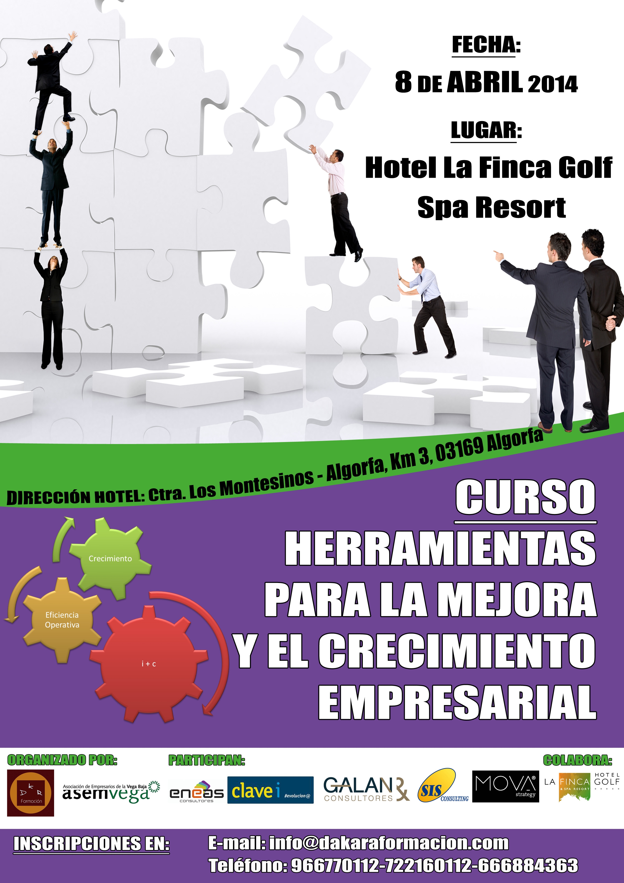 El próximo 8 de Abril dará comienzo el CURSO DE HERRAMIENTAS PARA LA MEJORA Y EL CRECIMIENTO EMPRESARIAL, será impartido en el Hotel La Finca de Algorfa.
