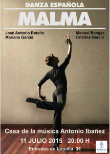 La Casa de la Música Antonio Ibáñez acoge este sábado 11 de julio el espectáculo de Danza Española ‘Malma’ a las 20 horas. El acto está organizado por José Antonio Botella y colabora la Concejalía de Cultura del Ayuntamiento de Redován. El precio de las entradas -de venta en taquilla de la Casa de la Música- es de 3 euros.