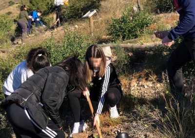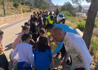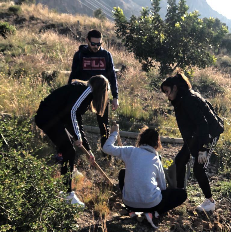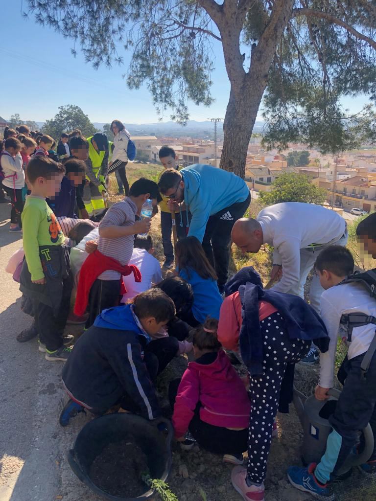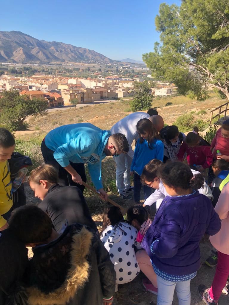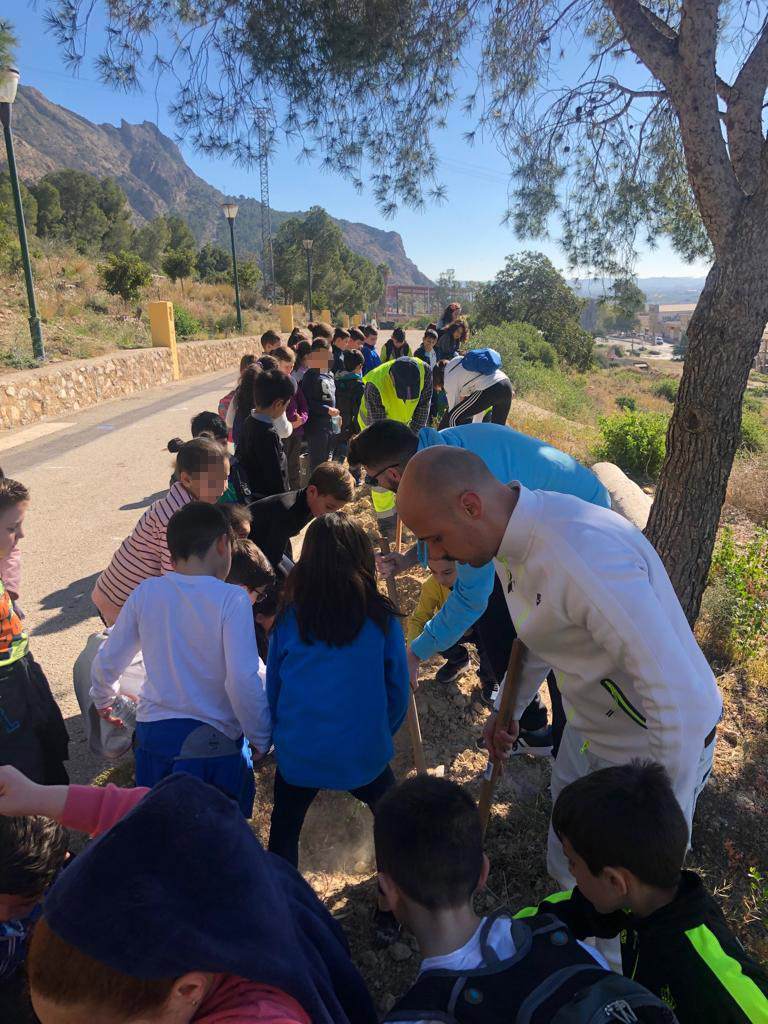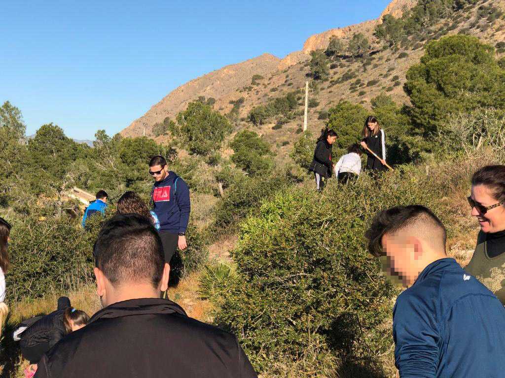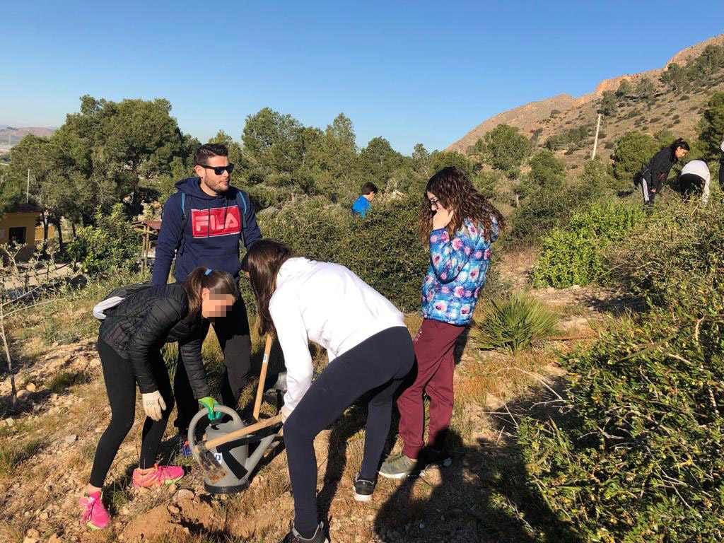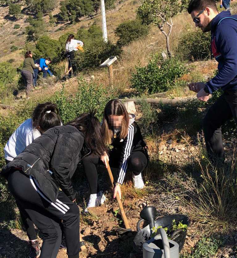 Redován 5/2/2019. El alumnado del Colegio Sagrados Corazones y del IES Jaime de Sant-Ángel de Redován contribuye estos días a la reforestación de la falda de la sierra, en la zona de la Ermita, con una plantación de especies autóctonas que se prolongará hasta el jueves.