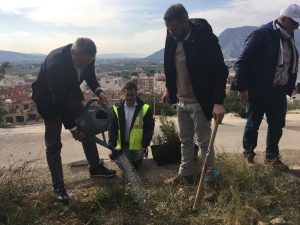 Tras la visita a las oficinas se ha llevado a cabo la primera jornada de reforestación en el Paraje La Ermita, preludio de la actuación integral que se va a realizar en la zona en los próximos meses. Para esta campaña se han seleccionado especies vegetales que mejorarán la calidad ambiental y paisajística del entorno como el ciprés, el espino negro, el lentisco, algarrobo, efedra, romero, palmito o bayón.