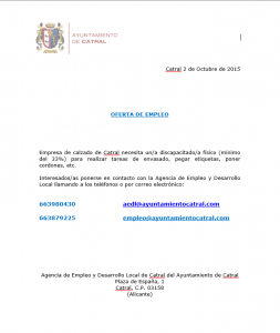 Empresa de calzado de Catral busca a una persona con discapacidad física (mínimo 33%) para realizar tareas de envasado, etiquetado, etc. Infórmate en los teléfonos y correos electrónicos que te ofrecemos: