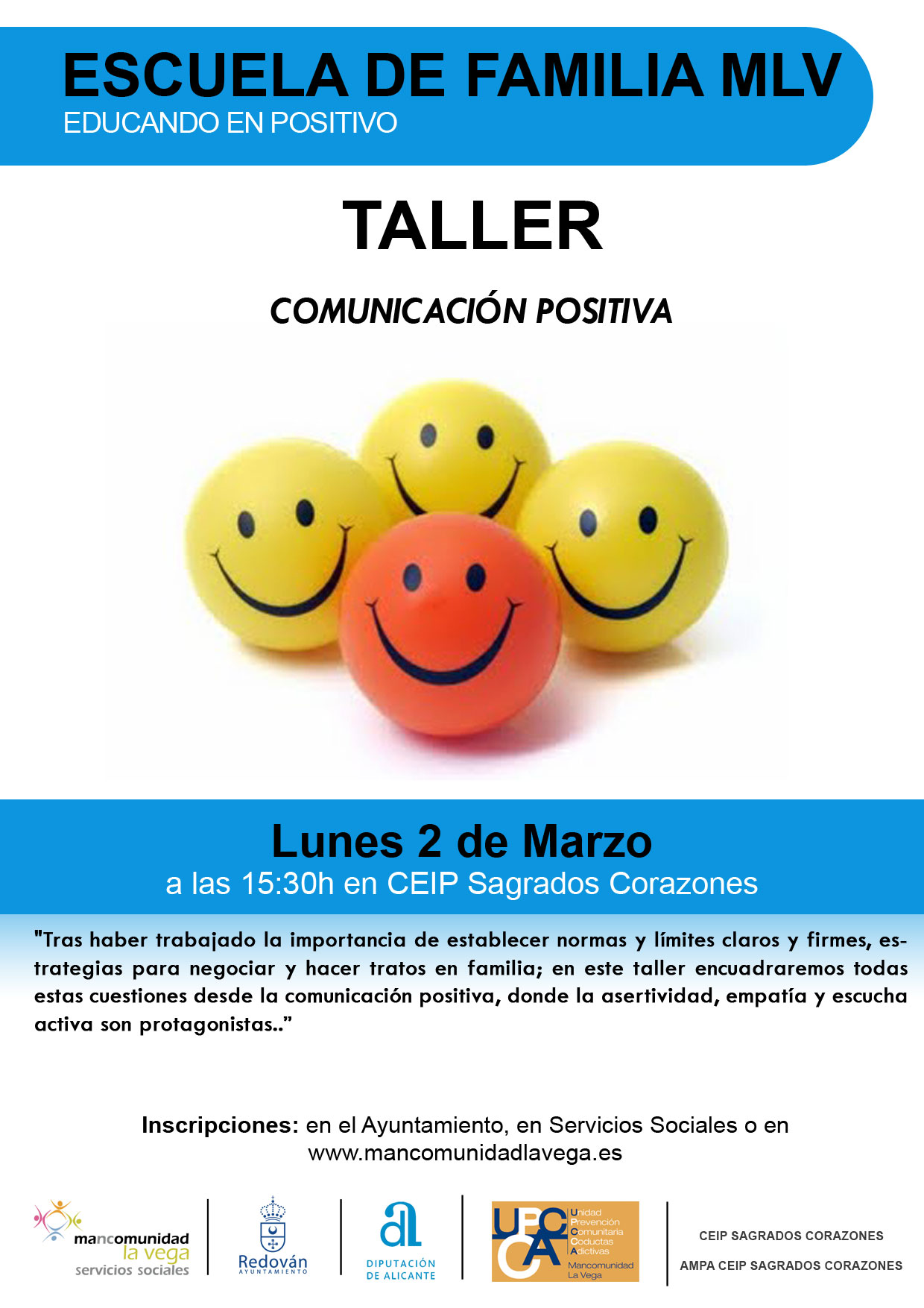 El proximo lunes 2 de marzo se realiza una nueva sesion/taller de la Escuela de Familia en Redován. La jornada abordará los principales aspectos de la comunicación positiva y empezará a las 15.30 horas en el Colegio Sagrados Corazones. Las inscripciones se pueden realizar en el Ayuntamiento de Redován, en Servicios Sociales o en www.mancomunidadlavega.es
