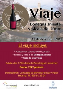 4 de diciembre la Concejalía de Bienestar Social y Mujer ha organizado una excursión a las Bodegas de Iniesta y Alcalá de Júcar. Las personas que esten interesadas deben dirigirse a la Concejalía. El precio es de 25 € e incluye: autobús, visita a las bodegas y cata de tres vinos; la comida es libre.