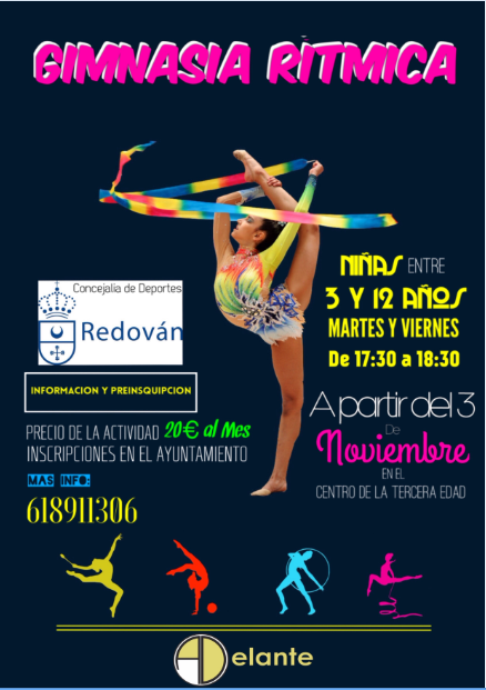 La Concejalía de Deportes de Redován organiza un curso de Gimnasia Rítmica para niñas de entre 3 y 12 años que se desarrollará los martes y los viernes de 17.30 a 18.30 en el centro de la Tercera Edad. El precio de la actividad es de 20 euros al mes y las clases dan comienzo el próximo 3 de noviembre. Más información en el teléfono: 618 911 306. Inscripciones en el Ayuntamiento.