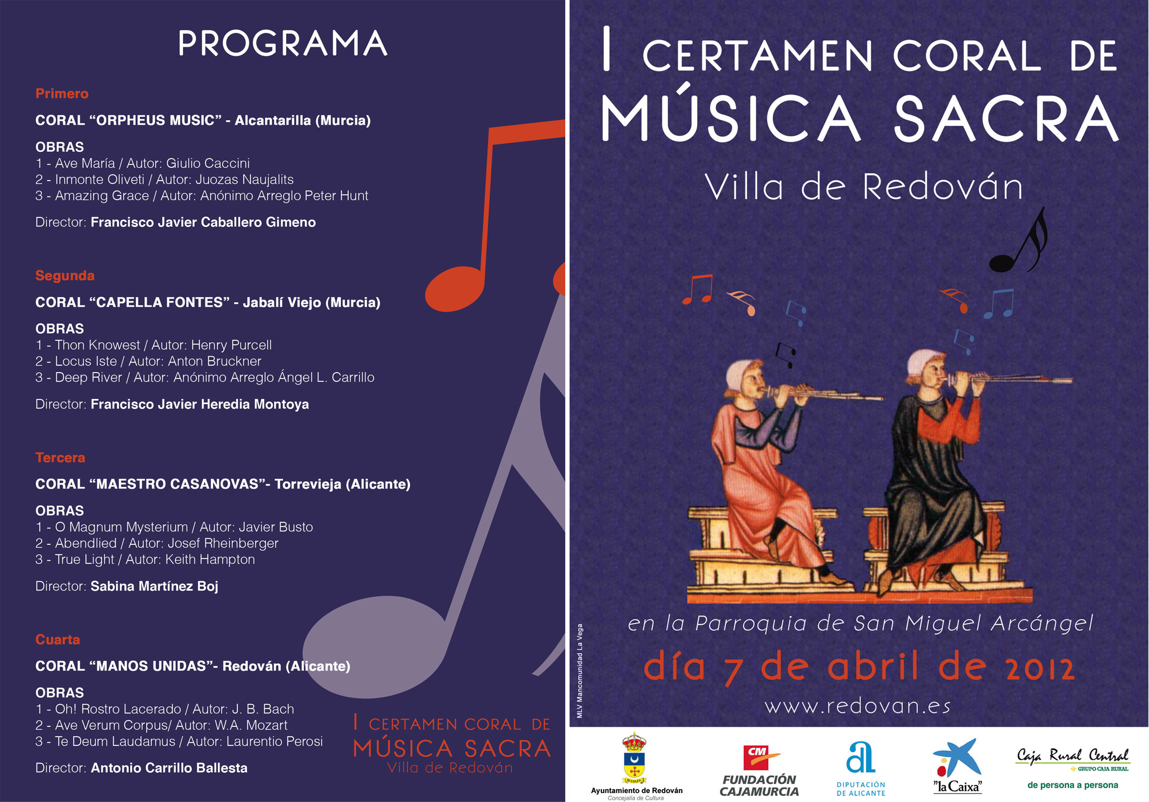 A las 18 horas del próximo sábado 7 de abril, en la Iglesia Parroquial, se celebrará el I Certamen Coral de Música Sacra «Villa de Redován» que contará con la participación de las corales de: