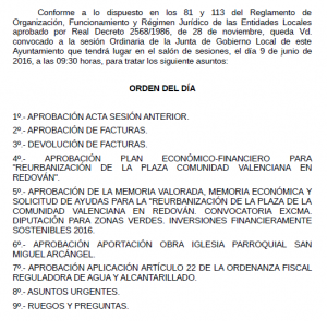El jueves 09 de junio el Ayuntamiento de Redován acoge una reunión de la Junta de Gobierno Local. Estos son los puntos del orden del día:
