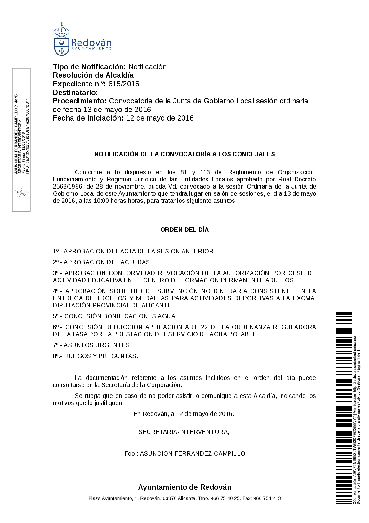 El viernes 13 de mayo el Ayuntamiento de Redován acoge una reunión de la Junta de Gobierno Local. Estos son los puntos del orden del día: