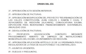 El jueves 13 de octubre el Ayuntamiento de Redován acoge una reunión de la Junta de Gobierno Local. Estos son los puntos del orden del día: