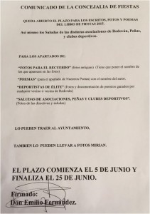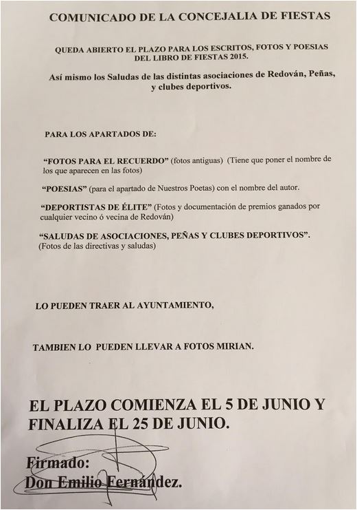 Si perteneces a alguna asociación, peña o club deportivo, o tienes alguna poesía, escrito o fotografía que te gustaría que saliese publicada en el Libro de Fiestas 2015, puedes acercarte al Ayuntamiento o al establecimiento Fotos Mirian para depositarlas. La Concejalía de Fiestas ha abierto el plazo de recepción de documentos hasta el próximo 25 de junio.