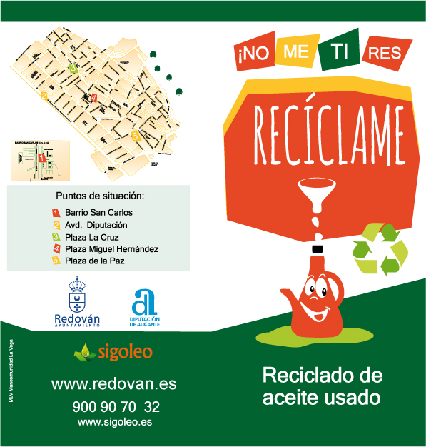 El Ayuntamiento de Redován ha suscrito un acuerdo con la empresa Sigoleo de recogida de aceites usados y ha instalado varios contenedores específicos de recogida de este tipo de desechos. Los contenedores se encuentran en la Avenida de la Diputación (en el Punto limpio), en la Carretera Nacional de Alicante-Orihuela a su paso por el Barrio de San Carlos (enfrente Restaurante San Carlos) , en la Plaza de la Cruz, en la Plaza de Miguel Hernández y en la Plaza Paz Arcos. Recuerda que el aceite se debe depositar en envases de plástico bien cerrados.