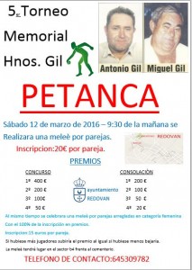 Vamos preparando el equipo para participar en el quinto Torneo Memorial Hermanos Gil de Petanca que se celebrará el próximo sábado 12 de marzo en Redován a partir de las 9.30 horas de la mañana. El precio de la inscripción por parejas es de 20 euros. Teléfono de contacto: 645 309 782. Llama e infórmate.