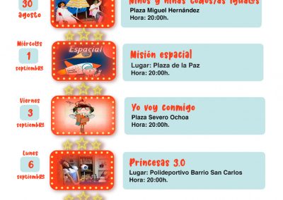 También para el público infantil, desde la Concejalía de Servicios Sociales y la Mancomunidad La Vega se ha programado el ciclo de teatro ‘Las plazas de la igualdad’ que ha comenzado esta misma semana. Las representaciones continuarán el 6 de septiembre en el polideportivo del Barrio San Carlos y culmina el día 10 en la Plaza de la Cruz. Todas serán a las ocho de la tarde y en este caso no es necesario inscripción previa, aunque si que habrá que hacer el registro a la entrada y se permitirá el acceso hasta completar el aforo, además de otras medidas frente al COVID-19.