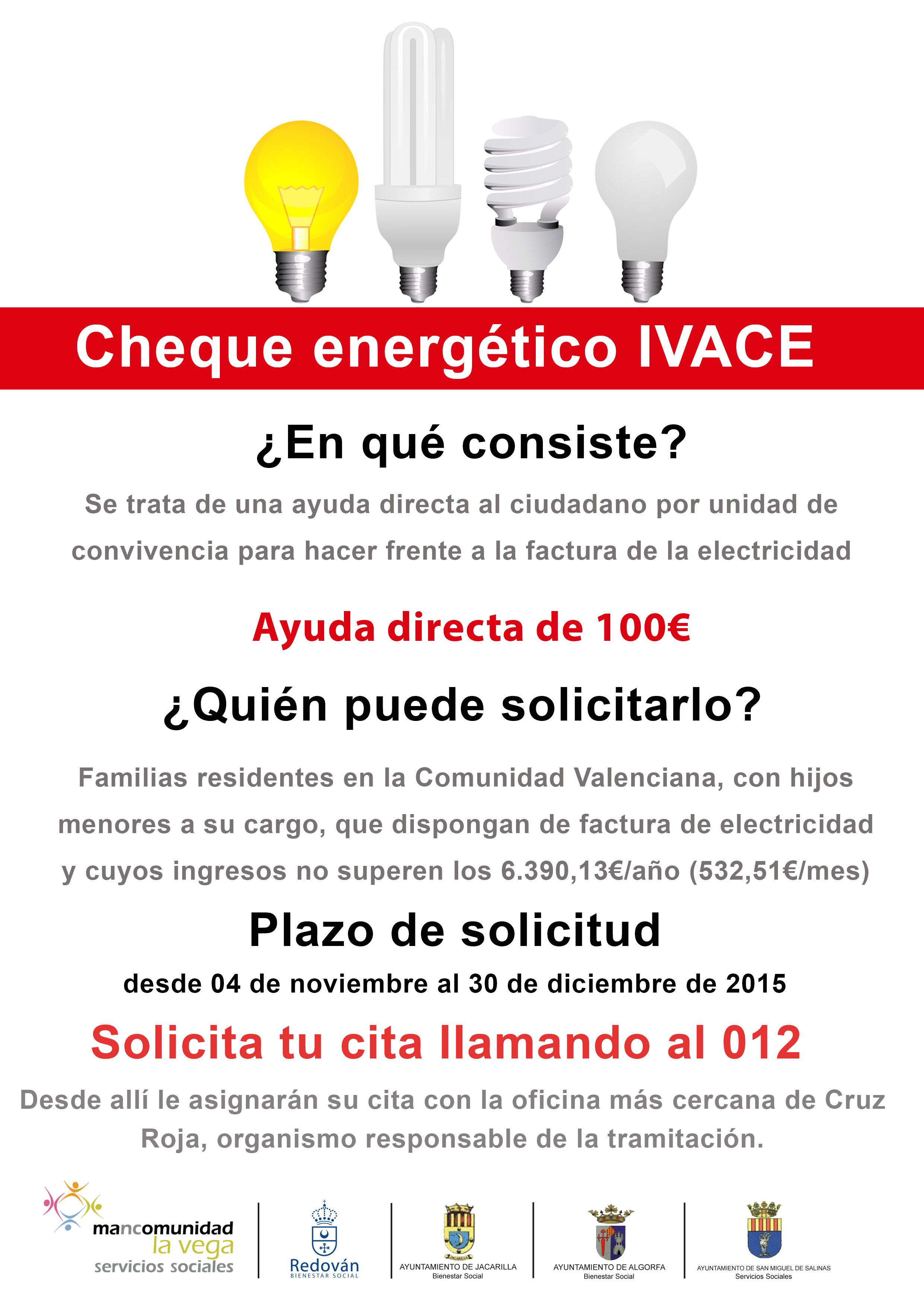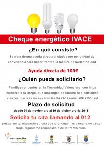 El Instituto Valenciano de Competitividad Empresarial (IVACE) ha puesto en marcha una ayuda energético social denominada Cheque energético dirigido a familias con hijos menores de 18 años que residan en la Comunidad Valenciana con unos ingresos inferiores a 6390,13 € al año (532,51 € mensuales).