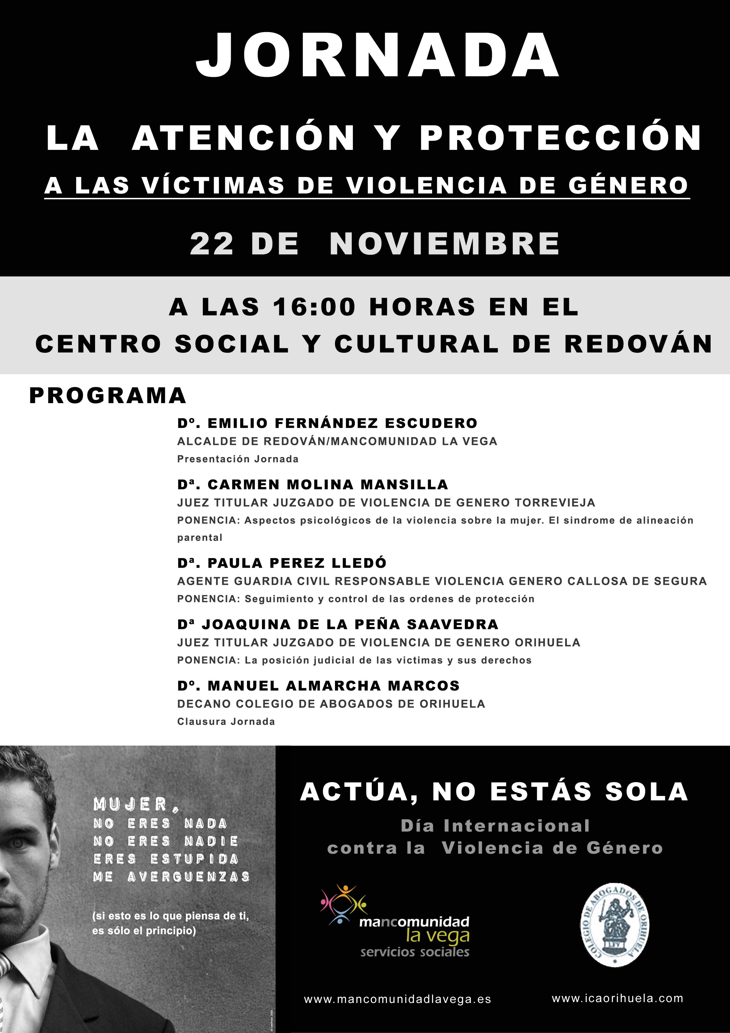 a celebración del Día Internacional contra la Violencia de Género, la Mancomunidad la Vega conjuntamente con el Colegio de Abogados de Orihuela han organizado la Jornada «La atención y protección a las victimas de violencia de género».