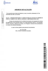 Redován 28/11/2017. El Ayuntamiento de Redován ha puesto en marcha la segunda convocatoria de este año para ayudar económicamente a las personas que han emprendido un negocio en el municipio durante los últimos meses. La convocatoria fue aprobada en la Junta de Gobierno Local el pasado 27 de noviembre y la presentación de solicitudes está abierta hasta el 7 de diciembre.
