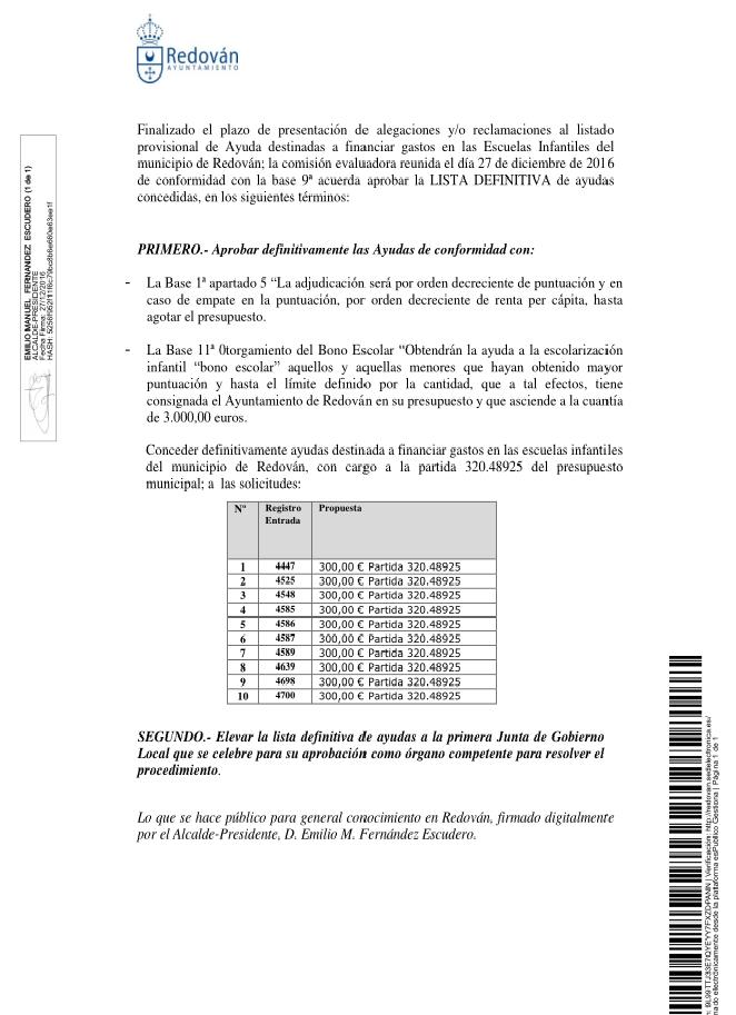 Finalizado el plazo de presentación de alegaciones y/o reclamaciones al listado provisional de Ayuda destinadas a financiar gastos en las Escuelas Infantiles del municipio de Redován; la comisión evaluadora reunida el día 27 de diciembre de 2016 de conformidad con la base 9ª acuerda aprobar la LISTA DEFINITIVA de ayudas concedidas, en los siguientes términos: