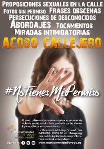 El acoso callejero es una forma de violencia sexual que puede ser perpetrada tanto en espacios públicos como en espacios privados de acceso público. Se trata de un conjunto de conductas físicas y verbales que se llevan a cabo contra una persona sin su consentimiento: frases obscenas, persecuciones, tocamientos, fotos sin permiso, miradas intimidatorias, abordaje, exhibicionismo y un largo etcétera. La iniciativa popular para combatir estos actos ha arrancado con la creación de la web www.notienesmipermiso.org y el lanzamiento de una campaña de firmas en la plataforma Change.org, además del hastag #NoTienesMiPermiso.