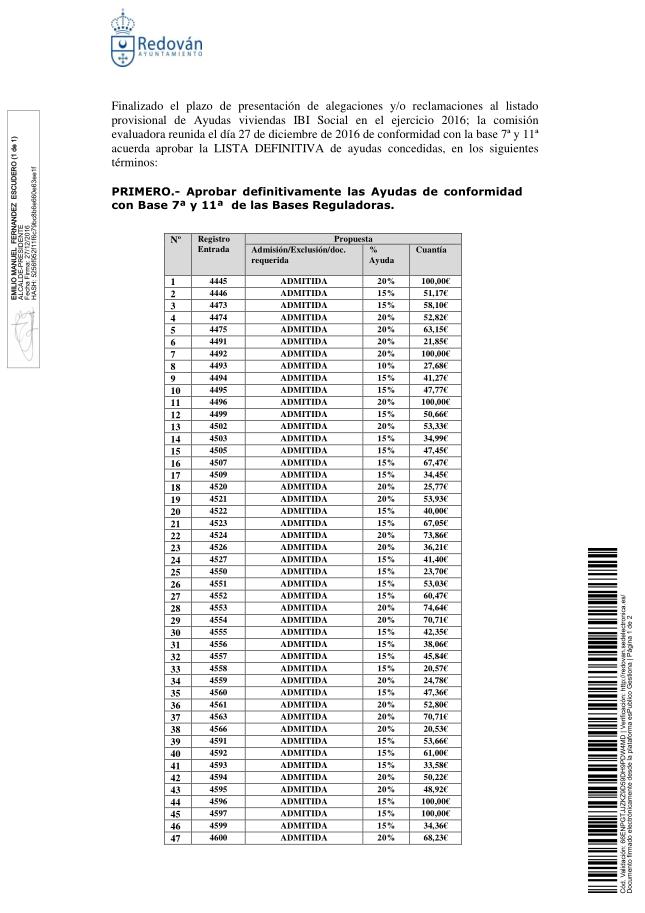Finalizado el plazo de presentación de alegaciones y/o reclamaciones al listado provisional de Ayudas viviendas IBI Social en el ejercicio 2016; la comisión evaluadora reunida el día 27 de diciembre de 2016 de conformidad con la base 7ª y 11ª acuerda aprobar la LISTA DEFINITIVA de ayudas concedidas, en los siguientes términos: