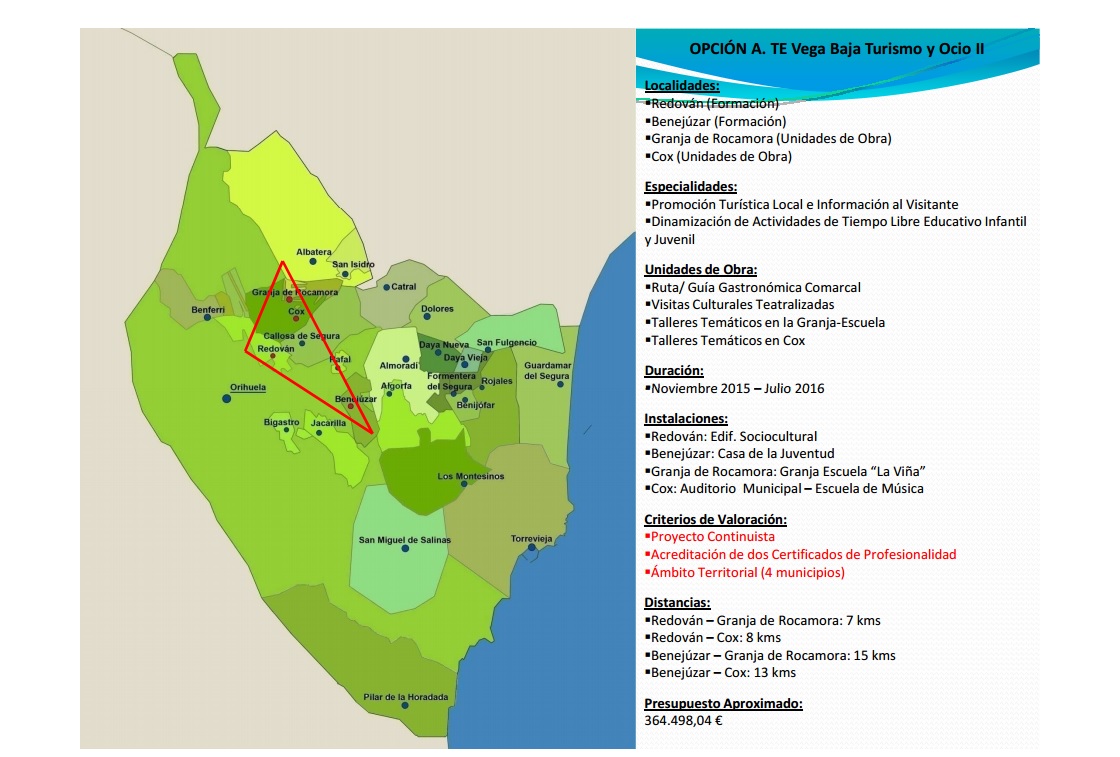El Ayuntamiento de Redován ha solicitado, junto con otros tres municipios de la Vega Baja, la realización de un nuevo Taller de Empleo sobre Ocio y Turismo que se desarrollará si lo concede el Servef entre noviembre de 2015 y julio de 2016. El curso, organizado por CONVEGA, da continuidad al que ya se ha venido realizando en la localidad. Infórmate en el Ayuntamiento.