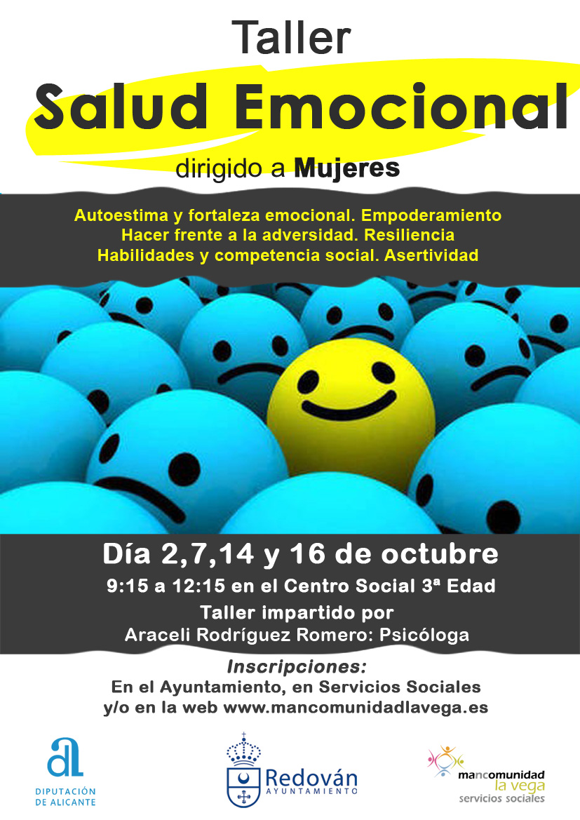 Durante los días 2, 7, 9 y 14 de octubre se va a realizar el taller de Salud Emocional para Mujeres dentro de las acciones contempladas en el programa DONA SALUD. Si estás interesada, deja tu solicitud en el Ayuntamiento y si no te da tiempo, presentate en el taller a la hora de inicio. Más info en la web de la mancomunidad https://bit.ly/1xxsHXe