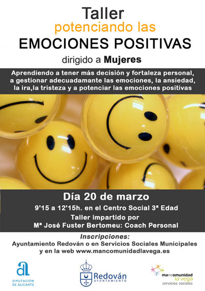 TALLER POTENCIANDO LAS EMOCIONES POSITIVAS. El taller será impartido por María José Fuster, Coach Personal el próximo jueves 20 de marzo de 9,15 a 12,15 horas en el Centro Social de la Tercera Edad. Para más info e inscripciones en la web de la mancomunidad https://www.mancomunidadlavega.es/index.php/id-07—taller-potenciando-las-emociones-positivas.html