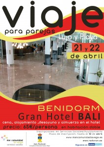 Hasta el 10 de abril podrán inscribirse a la edición de este año del Viaje para Parejas que se va a realizar el fin de semana del 21 y 22 de abril al Hotel Bali de Benidorm. Las plazas son limitadas y el precio es de 65 euros/persona e incluye pensión completa (con bebidas) animación nocturna, alojamiento y desplazamiento. Para personas menores de 65 años. Más información e inscripciones en Servicios Sociales y/o en el Ayuntamiento y en la web de la mancomunidad. Pulsa sobre la imagen para más información y/o bajarse la solicitud